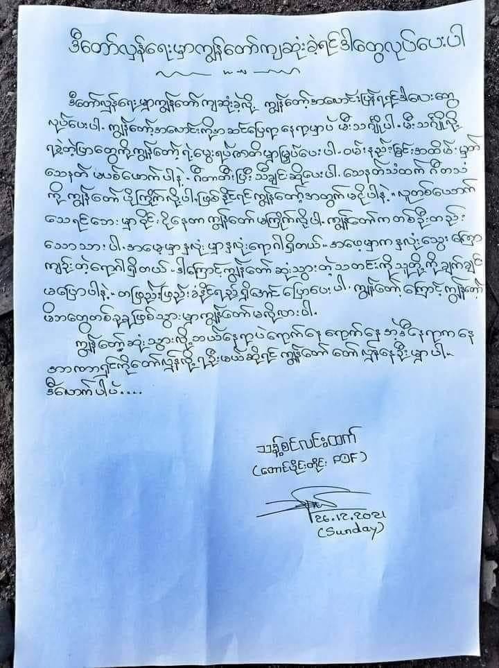 The Burmese story is still unfolding, and yet so little of their experience is making it beyond their borders. I hope that posts like these can do just a little to help bring their voice and their struggles to those reading from afar. The following letter was written by a Burmese member of the People’s Defense Force, and touches upon a shared humanity that simply breaks the heart when read through. The translation appears below.