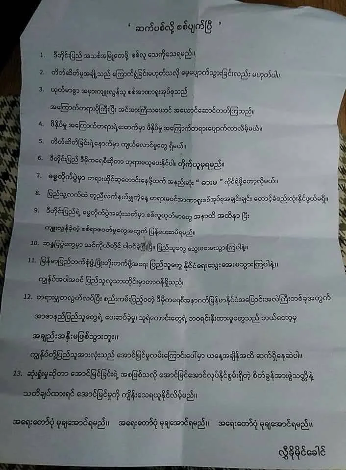 12. တရားမျှတလွတ်လပ်ပြီး စည်းကမ်းပြည့်ဝတဲ့ဒီမိုကရေစီ အနာဂတ်မြန်မာနိုင်ငံအပြောင်းအလဲကြီး တစ်ခုအတွက်အာဇာနည်ပြည်သူတွေရဲ့ ပေးဆပ်ခဲ့မှု၊ သူရဲကောင်းတွေရဲ့ ဘဝရင်းနှီးထားမှုတွေသည် ဘယ်တော့မှ အချည်းအနှီးမဖြစ်သွားဘူး။