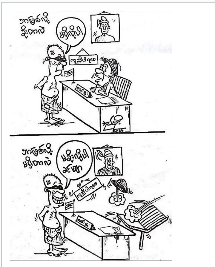 This scene, illustrated by a Burmese cartoonist, highlights the harsh realities faced by many in Myanmar today. The collapse of societal structures, pervasive corruption, and the brutal crackdown on dissent have left the population struggling for survival. The widespread mistrust of authority is not without reason—security forces have systematically betrayed their mandate, turning against the very people they are supposed to protect, further exacerbating the harsh realities faced by ordinary citizens. A gaunt man stands in front of a stern police officer. The officer sits behind his desk, his face stern and skeptical, tapping his pen against a sheet of paper. He eyes the man, whose clothes are worn and whose face bears the kind of weariness that only comes from years of scraping by. The cartoon reflects the grim struggle faced by ordinary people in post-coup Myanmar, where the complete collapse of governance has plunged the country into severe economic hardship, widespread corruption of officials, and relentless oppression. The lack of basic public services, rampant abuse of power and corruption by officials, and systematic failure of governance have driven countless individuals to desperation. The officer's skepticism and the defiance of the "thief" illustrate the deep divide between those in power and those merely trying to survive. "Why did you steal?" the officer asks. His voice carries an edge, half demanding, half expecting a familiar answer. The man, who has been caught red-handed, scratches his head. He shrugs, as if the question is a bit too obvious, the answer too painfully simple. "I don’t have anything," he replies. The officer, unimpressed, leans forward. "Why don’t you have anything?" There is a pause, and a smile spreads across the man’s face—a smile that holds a touch of irony, a smile that says he has nothing to lose by telling the truth. He looks the officer straight in the eyes and says, "Because I didn’t steal." The police officer blinks. The man is calm, his smile widening as if he’s just pointed out the absurdity of the world in a single phrase. The officer sits back in his chair, his mouth agape, his hat falling off as he tries to process the logic—or perhaps, the bitter truth—of the man’s words. The answer of the "thief" isn't just an excuse; it is a biting critique of the system. It is simple: in much of Myanmar today, those who don’t take what they want, end up with nothing. The thief’s defiant grin isn't the grin of someone proud of their crime; it is the grin of someone who has nothing left to prove. In his own way, he is exposing a cruel truth—that in a world where survival is often determined by what you can grab, the honest end up empty-handed. The police officer, representing a system meant to uphold law and order, sits stunned, momentarily lost for words. He knows that the thief's words cut deep into the heart of the corruption that plagues him and his peers. The officer shifts uneasily, realizing that his own graft and complicity in a broken system have directly contributed to the desperation of the man before him. And as the "thief" stands there, with his worn-out shirt and bare feet, the officer shifts uncomfortably, the room thick with a silence that feels like an accusation. It’s not just any silence, but the kind that accompanies a truth too raw to confront, not spoken in protest or anger, but simply as a matter of fact. It is as if he is saying, “What other choice do I have?” And in that silence, the officer is forced to face the bitter realization of his own corruption—the systemic graft that perpetuates this cycle of poverty and theft. He realizes that his own actions, and those of his peers, have contributed to the desperation driving the man before him. But instead of confronting this truth, the officer— perhaps standing in for Burmese authorities now serving the regime—opts for the easier path, ignoring the harsh reality that, sometimes, survival is an indictment of the very system meant to protect. This cartoon captures the brutal essence of Myanmar's struggle today, where systemic oppression, unchecked corruption of officials, and widespread poverty have left individuals with virtually no options but to defy a system that has abandoned them. The crushing weight of military rule and economic collapse has forced many into impossible situations, where survival itself becomes an act of resistance.